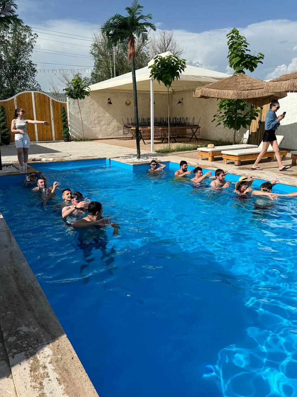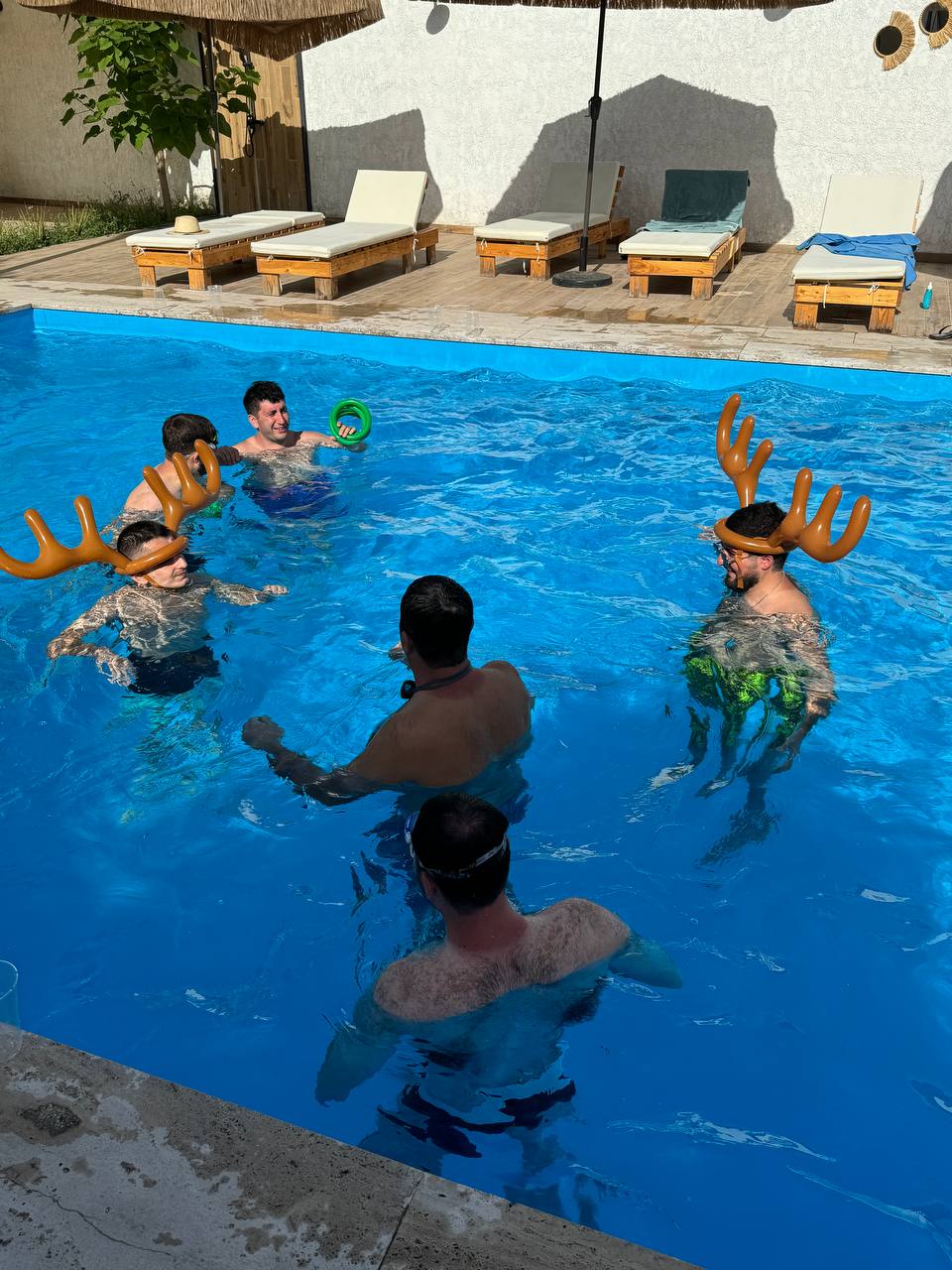 Of course we loved the fortress and the historic part, but now it was time to dive into some modern fun! We headed back closer to the city for the second part of our adventure: a poolside party. The transition from historical exploration to modern relaxation was smooth and all of us were so thrilled to jump straight into the water. We played some exciting games with a ball, cups and collar, but the funniest one was called "tent walk." We had to walk across the pool inside a big tent. It seemed easy, but believe us it was not. We kept falling over and the game became the perfect mix of chaos and laughter😃!